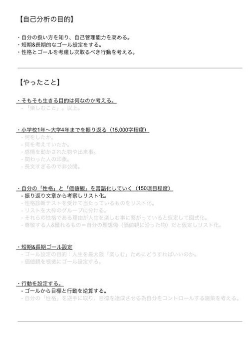 こんな感じで自己分析の目的やプロセス、分析結果、短期〜長期の目標をまとめたレポートと、箇条書きの性格をグループ化した図ができあがった🙄(ぼかしてます) pic.twitter.com/NSD8CtLepn
